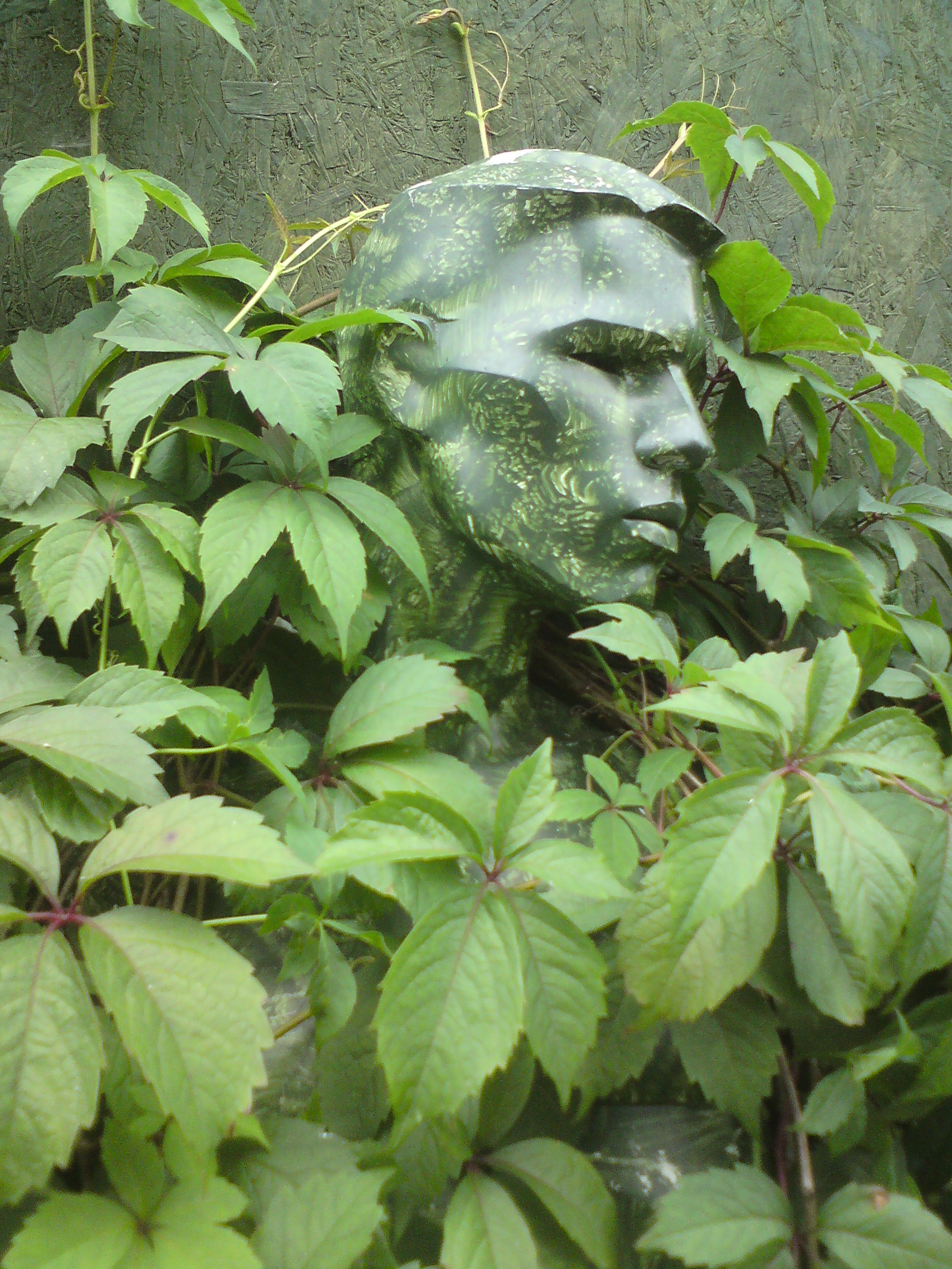 AP It has always been my quest in life to make human beings look better, probably out of self-dissatisfaction. Many people in the fashion industry are in it through self-dissatisfaction and are jokingly self-loathing. Fashion people are extremely critical of themselves as well as everybody else. They apply very high standards and the snobbery of fashion is built out of understanding this language of standards. This male face is the ultimate male face. For me it represents exquisite perfection with its slit eyes and over-hanging brow. The sculptor has taken it to an extreme and chiseled it so that it’s almost the opposite of a female ideal. Whilst gardening I decided to paint it and merge it with the background with the ultimate in male kitsch which is army camouflage – then grow Virginia Creeper over it.