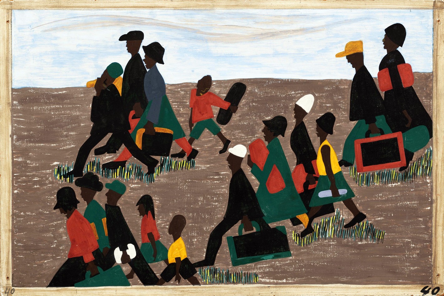 GS I think one of the interesting things about Jacob Lawrence’s Migration paintings is that you don’t see faces quite as clearly as you might. There’s a stylistic choice that he makes that takes away personally identifiable features. But there’s still a powerful sense of their humanity. So while Lawrence says, “Yes, this is my story, this is my family’s story,” – it’s much more than that – especially when you realise that for most African Americans at this time, family history was not easily obtainable. Pre ancestry.com and huge numbers of genealogical records – there were lots of family stories but little family history. So I think that at this time, for the artist, it had to be in a way a universal story.