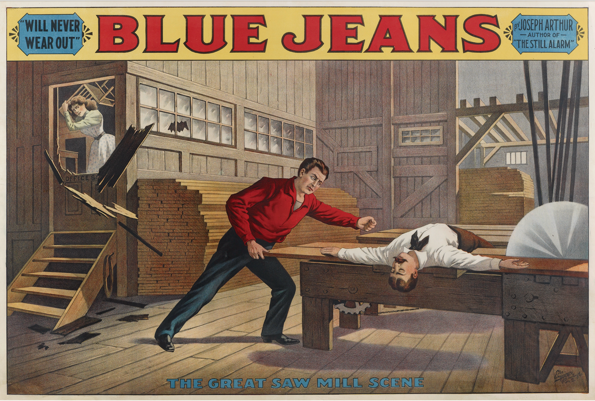 So, it’s the skill of that plot that’s beautiful. Now, the play also came about within another tradition of American theatre at this time, which is what we know as the “combination company”. America had experienced a depression, a financial crash with huge losses of major businesses, including the railways and many local theatres. The railways came to the theatres, and they said, look, you can probably only open one theatre in the town, but we’ll work out a way so that you can travel and carry the play with around. But because the variety theatre is gone, and the more serious theatre is struggling, you’d better think about including variety acts within the drama. So, this play has barbershop quartet and a local town band playing badly, but they constitute variety and so they are incorporated as well – and that’s enormously important. Melodrama is musical. Joseph Arthur is an astounding playwright, and he manages to bring all these elements together. And finally, he creates the scene that you see on the poster of the unconscious hero slowly moving towards the blade of the saw and that’s been copied in film right down to Bond films, where you see the hero – Bond – held down and menaced by an infernal machine.