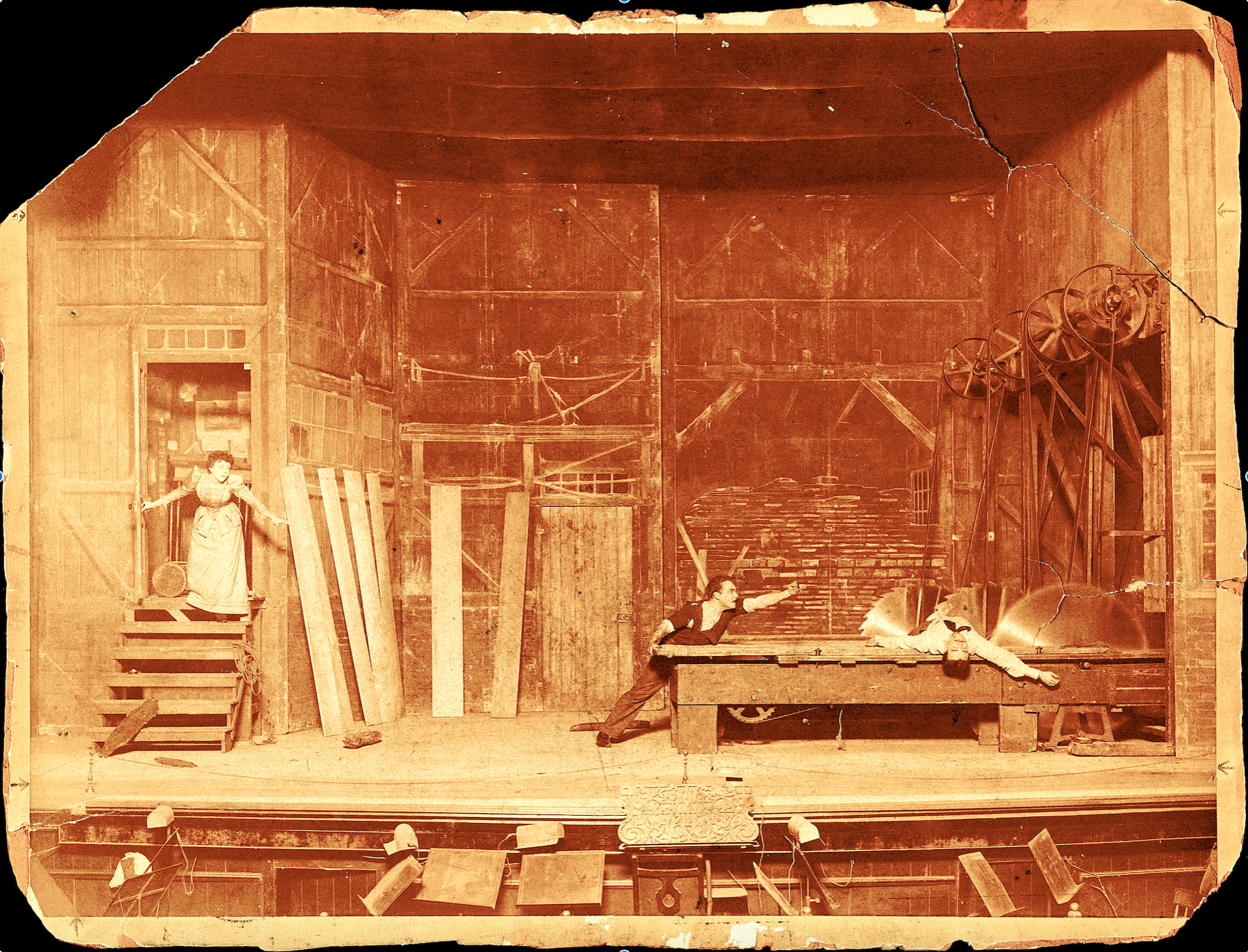 DM It is horrific. The photograph below is the earliest photograph to survive that was made in a theatre and that was placed on an easel outside the theatre. You’d be sitting in an audience watching the belts go around and the blades turn, and obviously they had the rasp of the saw as it cut through wood. And before Perry is on the saw bed the villain pushes some piece of lumber through, obviously pre-cut and ready to fall apart, so that audiences believed the saw worked.