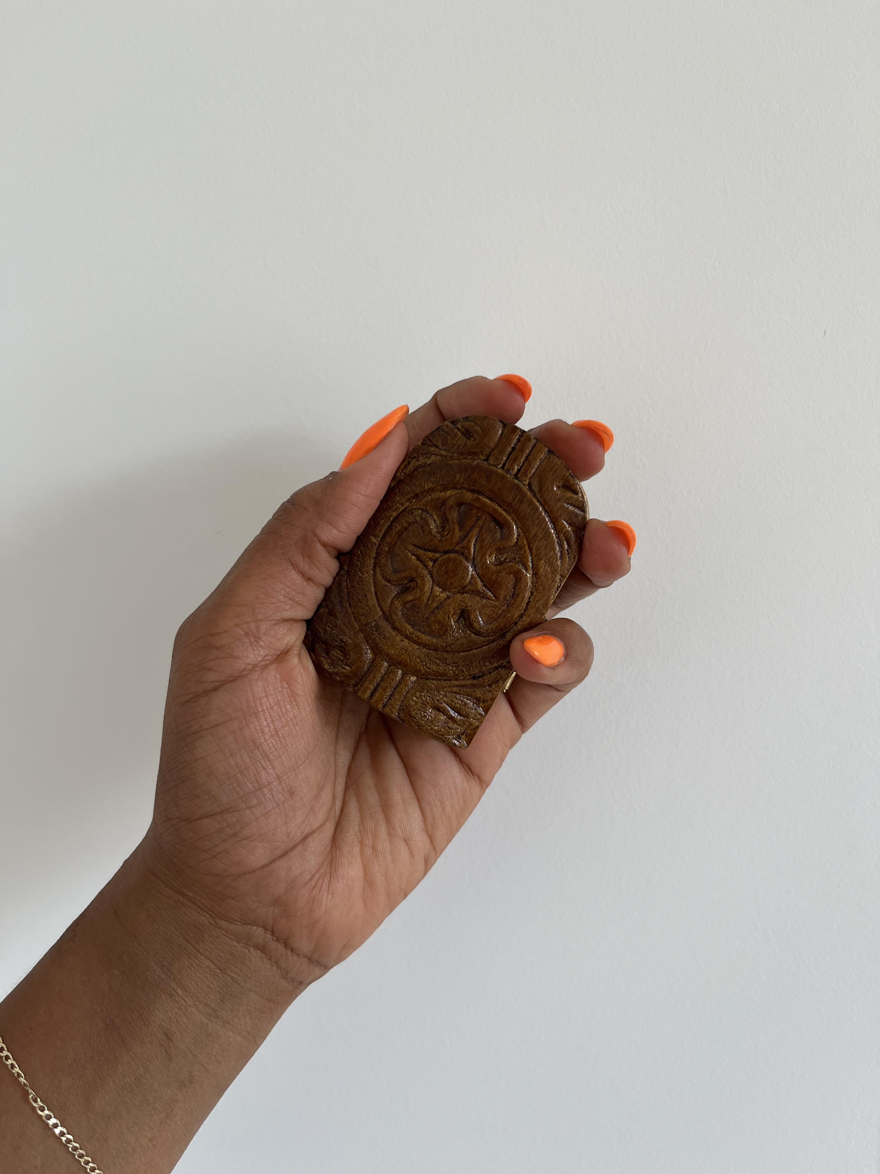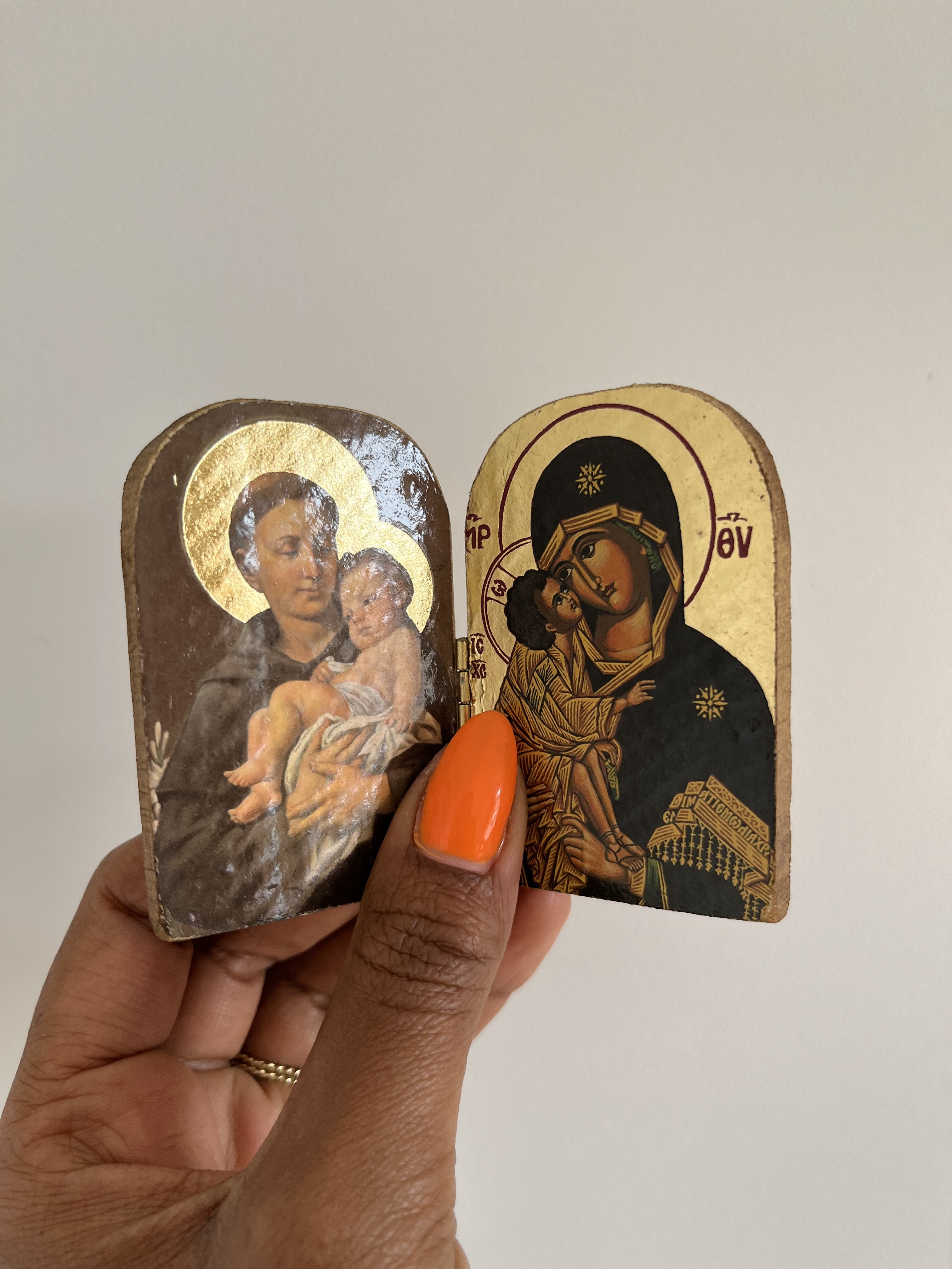 LM I’ve chosen it because it’s an artwork but it has a practical use. It’s ergonomic – and how many artworks can you say are ergonomic? I’m really intrigued by it. I don’t know where it’s come from or where it was made. It looks looks like it’s been handmade. It’s quite rustic, but not intentionally so, that’s just the nature of how it’s been made. I can’t tell where it’s from. The painting inside is of white people. It’s typical Catholic iconography that’s been printed and applied to this wood, so it’s probably not very expensively done. It has this gold leaf effect for the halos. I think it’s really beautiful and precious and it fits in the palm of your hand. I got it for £1.50 from a charity shop so I’ll never know where it’s originally from, but I imagine there’s some country in the world where you go and they’re selling loads of these.